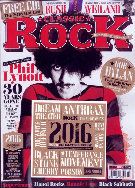 This month it'll be 30 years since the death of Thin Lizzy frontman Phil Lynott. We're marking the occasion with a celebration of his eventful (albeit sadly shortened) life, from the early years in Dublin, through to rockstar excess. We also bid farewell to Scott Weiland, looking at his tragic, arguably unavoidable passing. From the past to the present and future, we also look ahead with our 2016 Preview. Elsewhere you'll find features on Bob Dylan and Slim Chance. Plus our ultimate rock reviews section!