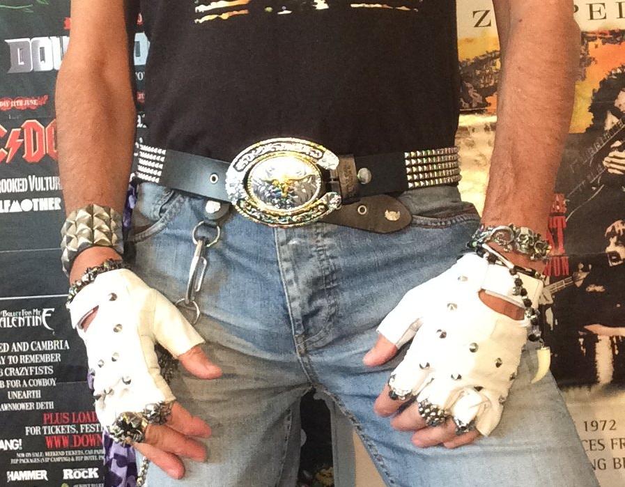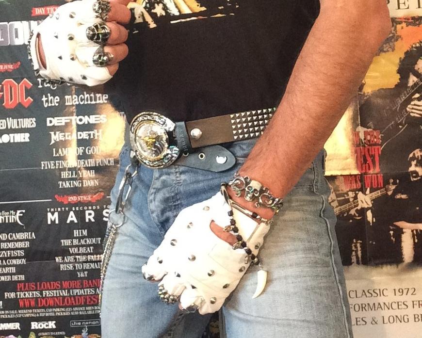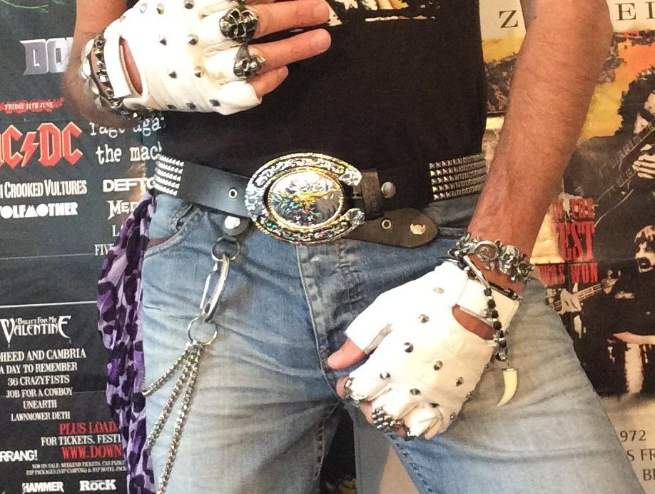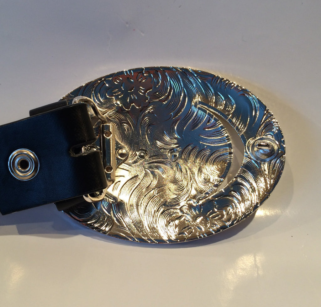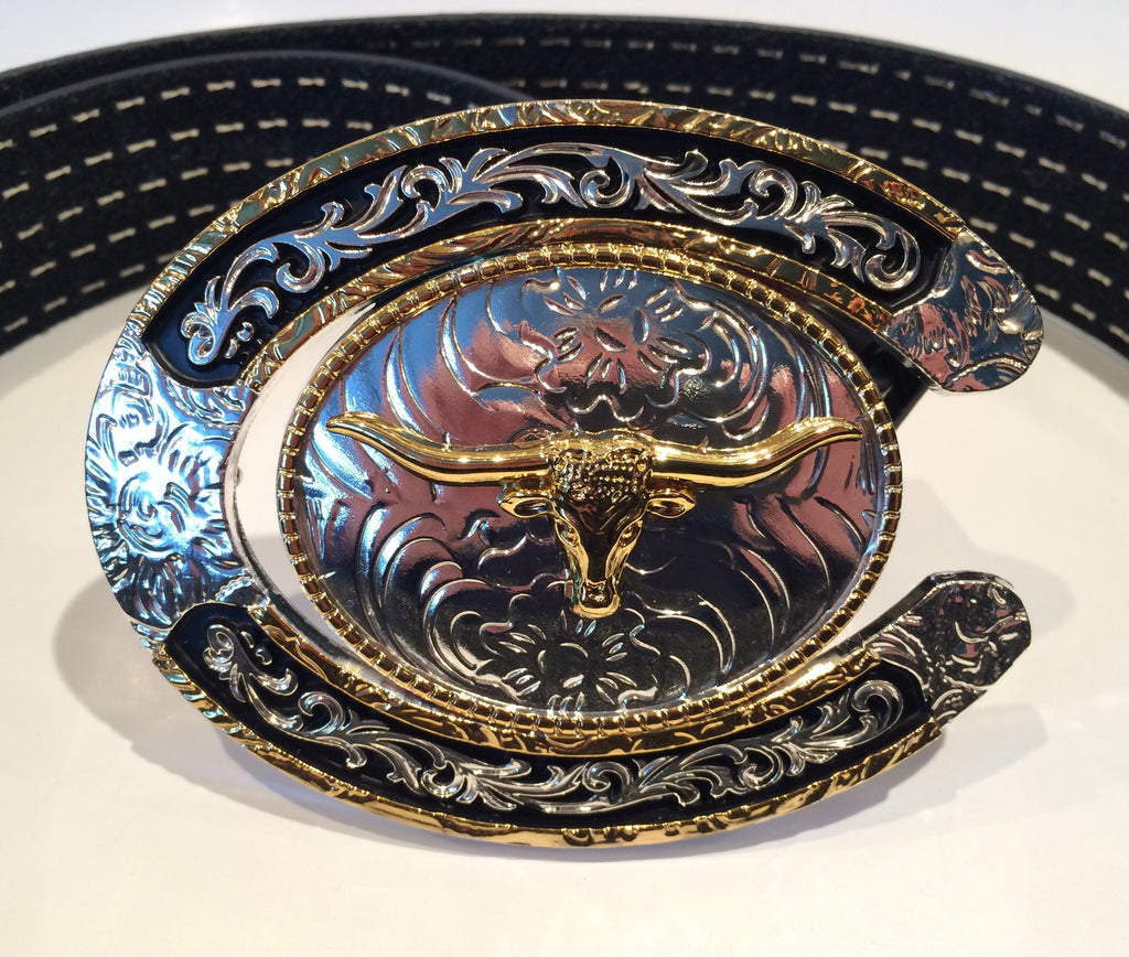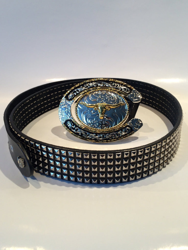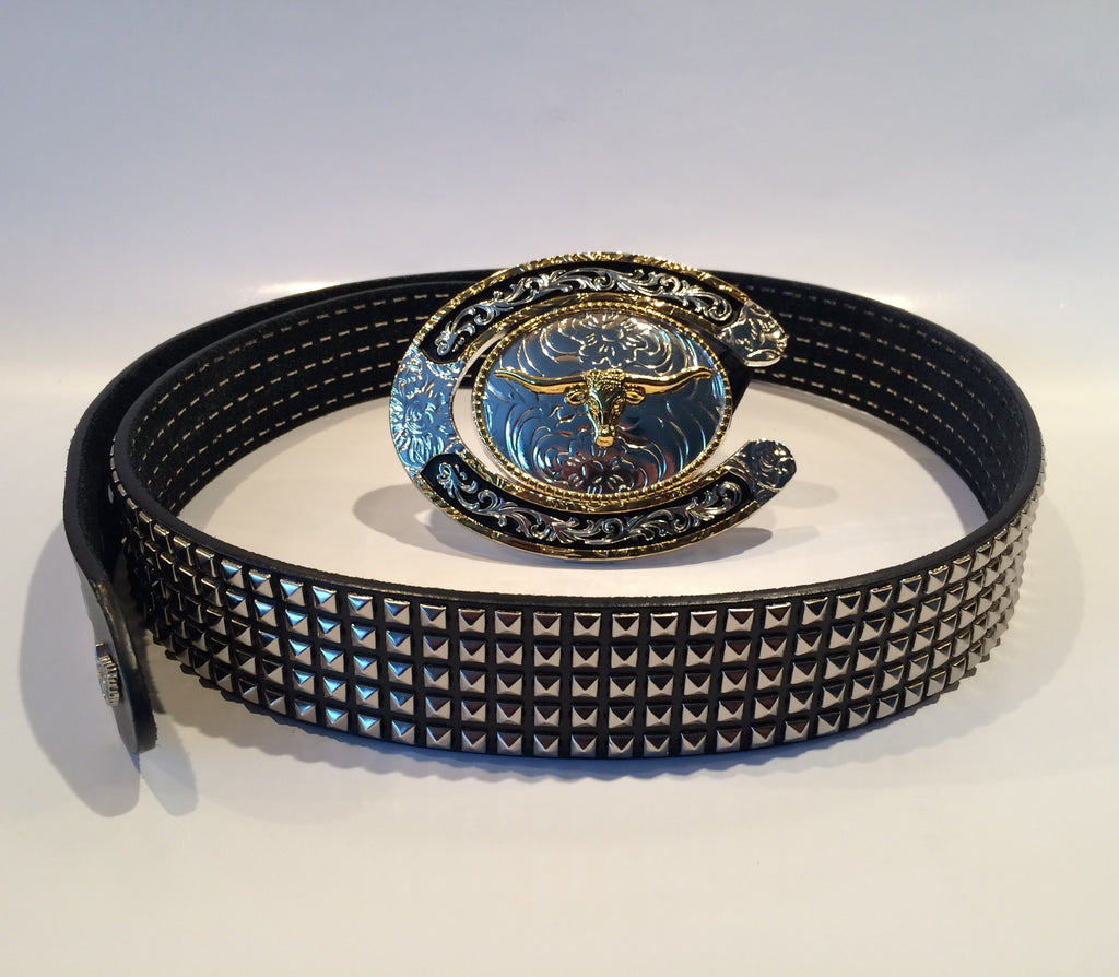 Shiny! Shiny! Shiny! This belt is the perfect choice for any Glamstar. With it's gold and silver two tone buckle, complete with outlaw 'longhorn' center-piece, and perfectly complimented by our 38mm wide, 5 row, small silver pyramid studded belt, it's just guaranteed to dazzle every time its worn.