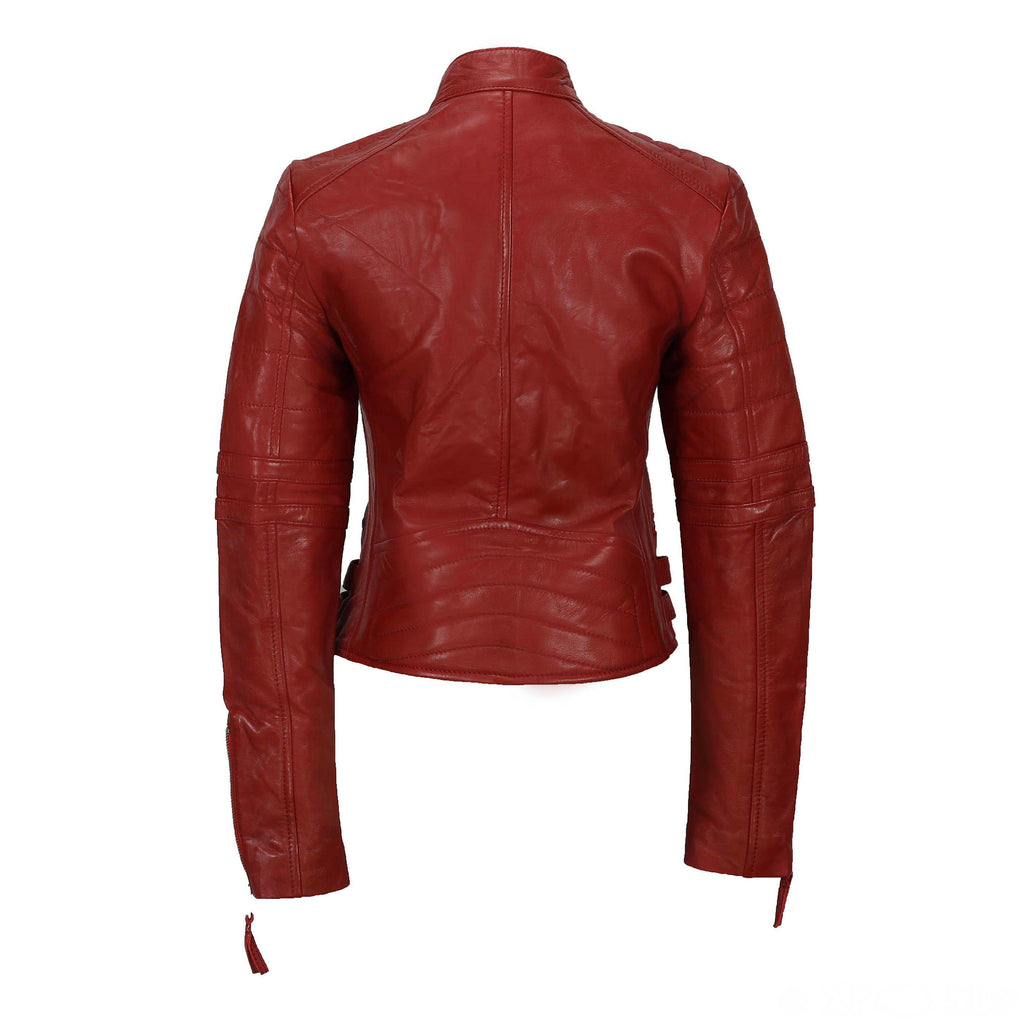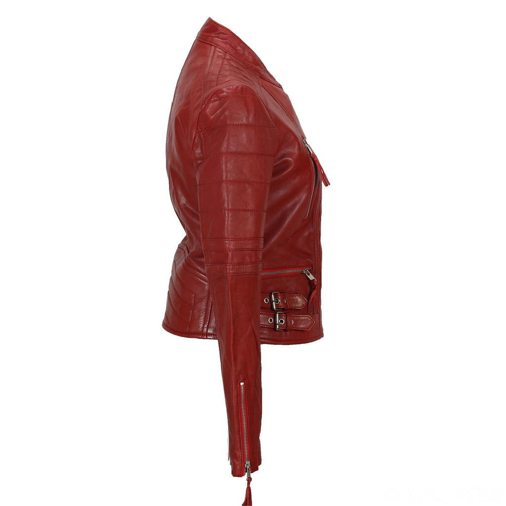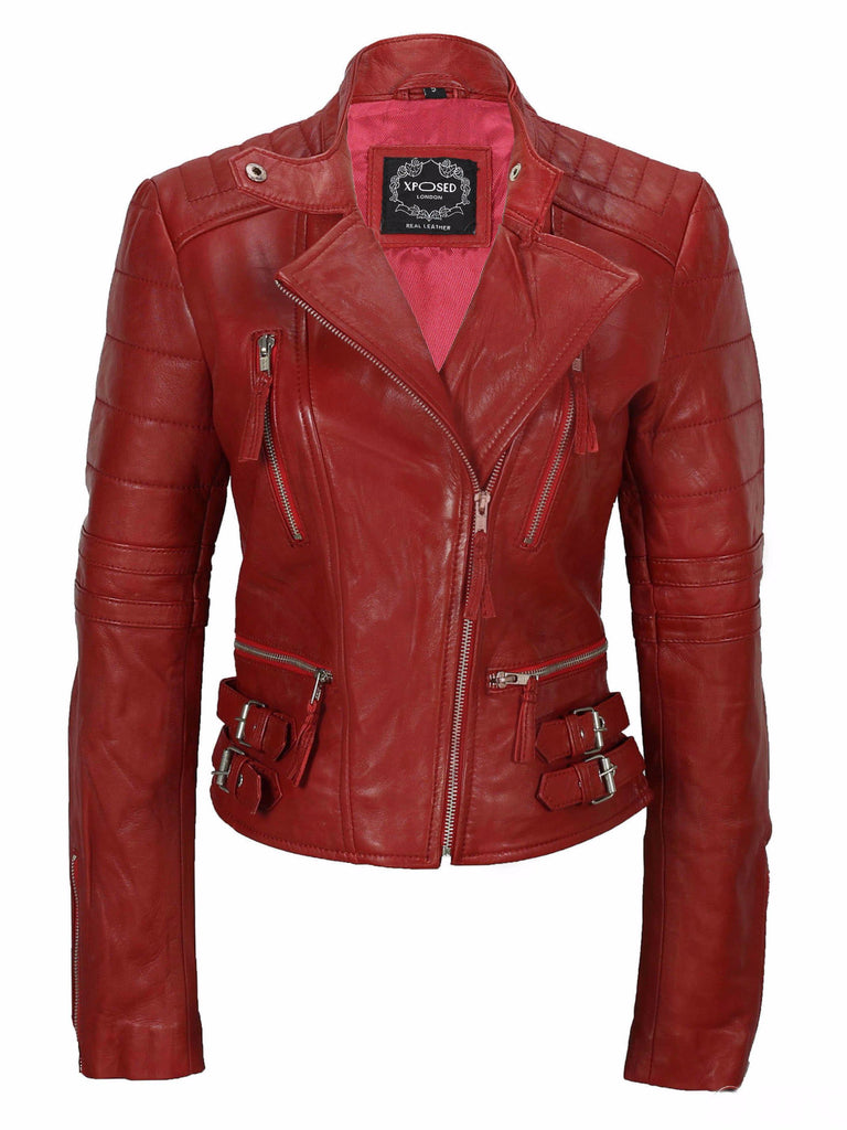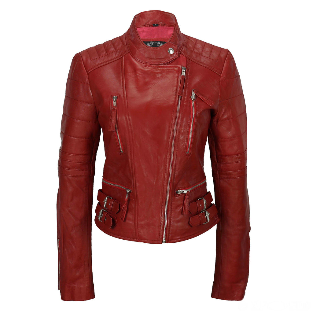 In true rock chick fashion the 'Red Rocker' is cut to the waist for a tapered fit, and features fold back lapels, a press stud collar strap, shoulder and upper arm ribbing, silvermetal YKK zips, red satin effect lining, zip cuffs, a selection of pockets, custom hardware and buckled waist adjusters.