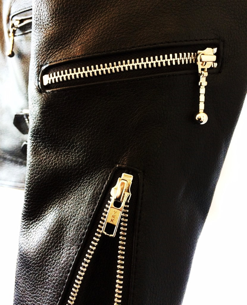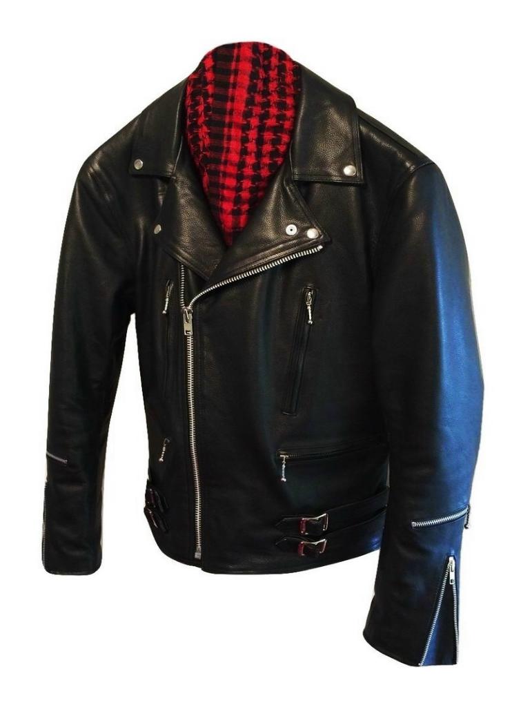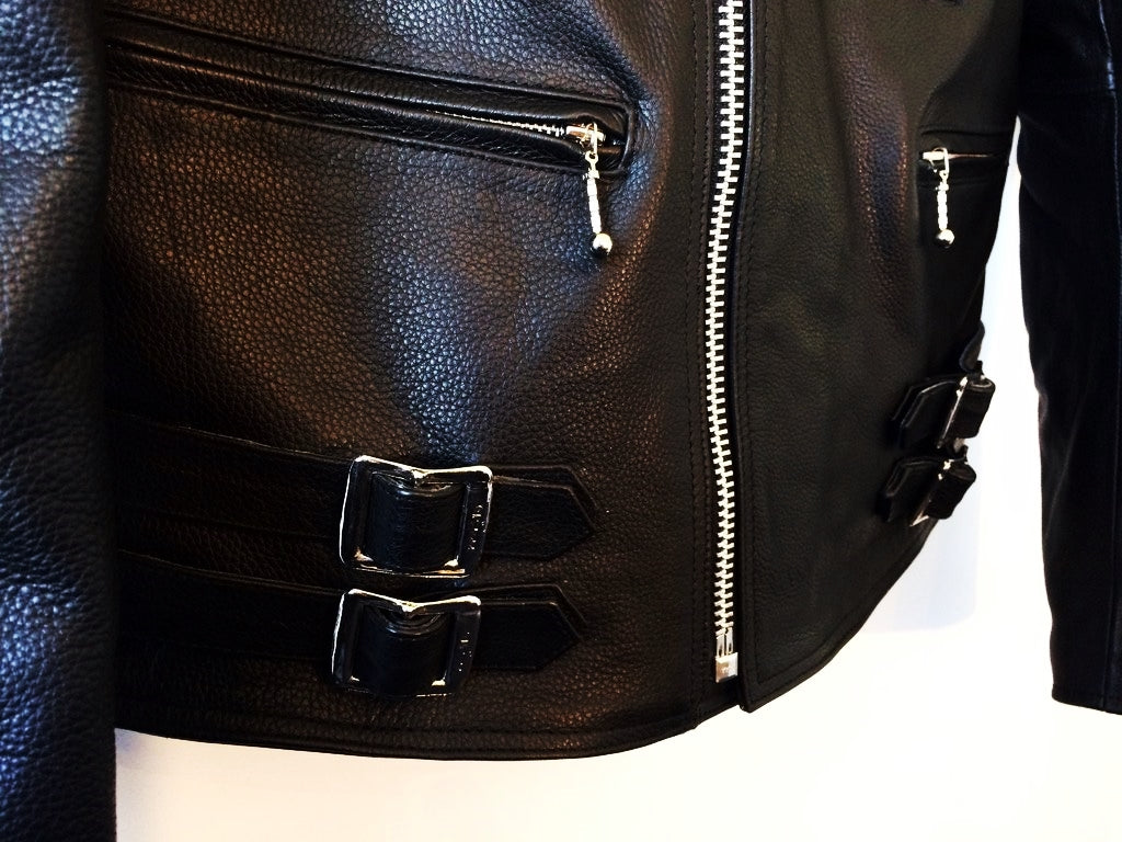 In true 80's style the jacket features the classic 'wide open' lapels design, large stand-up collar, plain shoulders, full back, tapered arms, silvermetal YKK zips with ball-drop pulls, red satin effect quilted lining, a selection of pockets, zipped cuffs and two sets of twin PPS buckled waist adjusters.